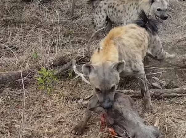 Загнанное животное сопротивлялось и кричало, именно это и привлекло внимание гиен. Дождавшись, пока львицы приступили к трапезе, они медленно начали приближаться к ним, угрожающе скалясь и запугивая охотниц саванны шумными звуками, похожими на кудахтанье и смех. Собрав стаю, насчитывавшую не менее 15 особей, гиены набросились на «цариц» и без труда прогнали их.