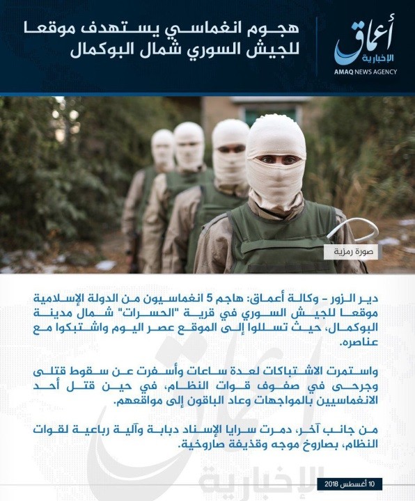 15.30 Сирия, провинция Дейр-эз-Зор Боевики группировки ИГ заявили о удачной атаке на позиции Сирийской армии в окрестностях города аль-Букемаль в провинции Дейр-эз-Зор. Как заявили сами исламисты, в атаке участвовали одновременно пять террористов-смертников. Правительственные источники данную информацию пока не прокмментировали.