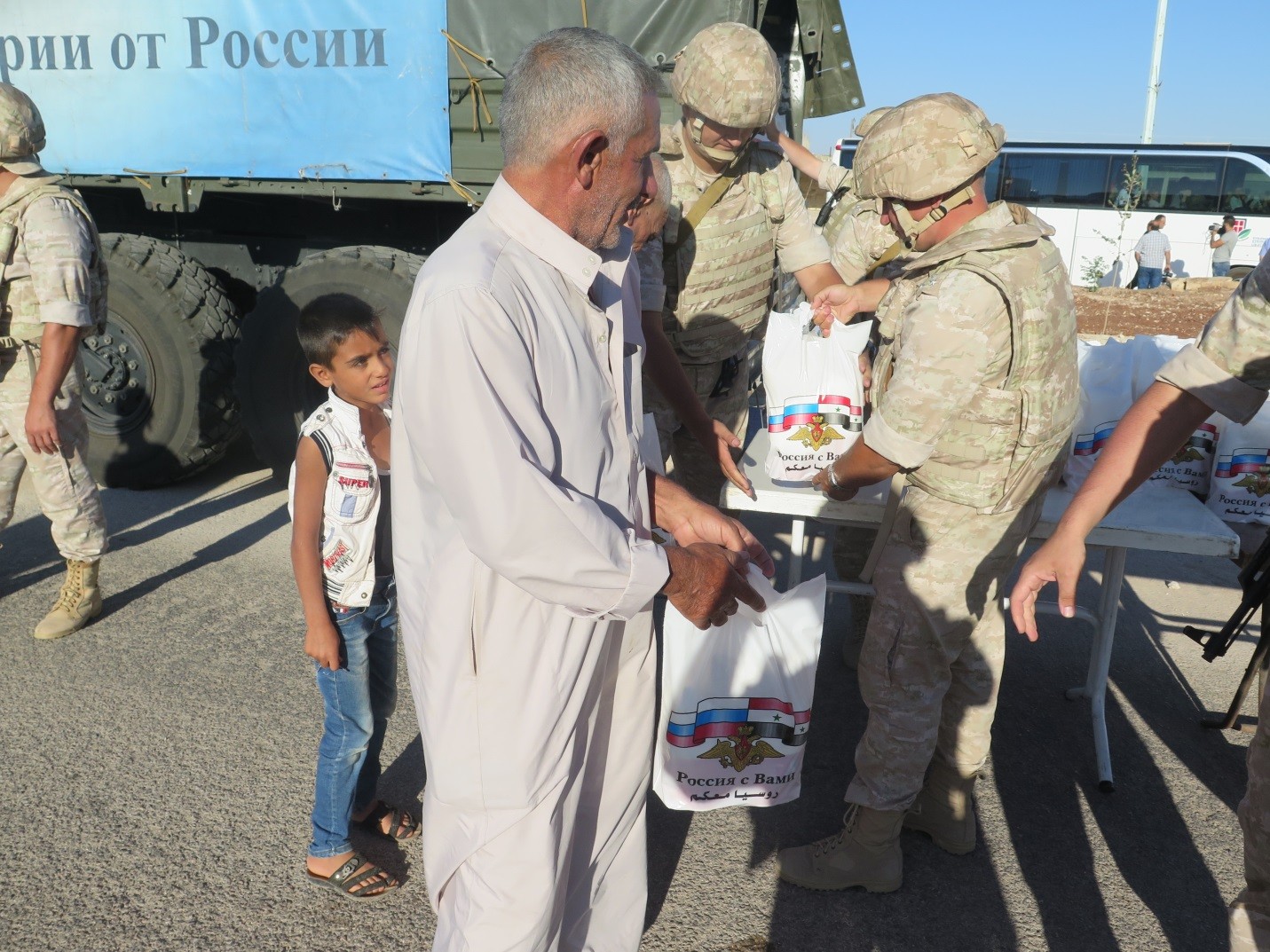 Жителям раздали 650 продовольственных наборов, в каждом из которых, самые необходимые продукты питания: сахар, мука, рис, мясные консервы. Военными врачами была оказана помощь 170 сирийцам из них 80 дети.