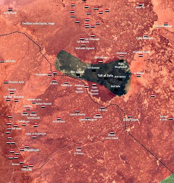 Военкор агентства САНА сообщил, что в районе Тлюль Ас-Сафа армия ведёт ожесточённые бои с террористами на направлениях Тель-Ганем, Умм-Марзах, Кабр Аш-Шейх Хусейн и Бурак Аль-Май.