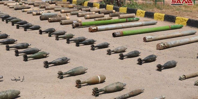 Корреспондент агентства САНА в провинции Дейр-эз-Зор сообщил, что компетентные органы в ходе прочесывания окрестностей города Меядин обнаружили большое количество оружия, боеприпасов и медикаментов западного производства, оставленных террористами ДАИШ.