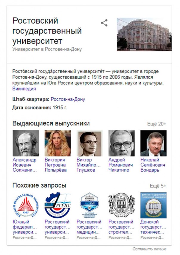 Так, при вводе в поисковую сроку название ВУЗа система автоматически выдает перечень известных персон, его окончивших.