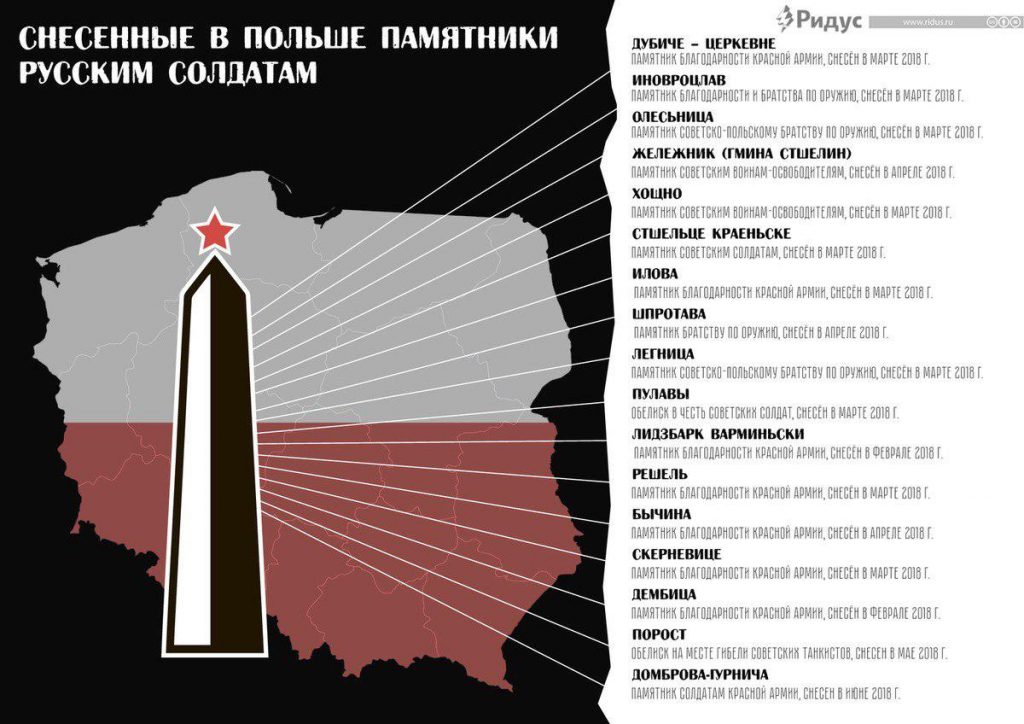Ранее председатель комитета Госдумы РФ по международным делам Леонид Слуцкий заявил, что Польша уничтожает памятники советским солдатам-освободителям, чтобы фальсифицировать историю Второй мировой войны. Источник