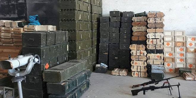 Корреспондент агентства САНА сообщил из провинции, что в ходе зачисток сапёрами освобождённых от бандформирований районов был найден склад оружия и боеприпасов, оставленный боевиками перед их отправкой на север Сирии.