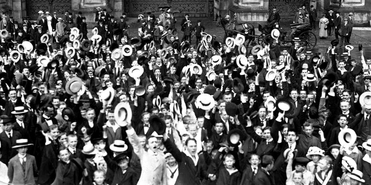 Радостные толпы на улицах Берлина после объявления войны Франции, август 1914 года
