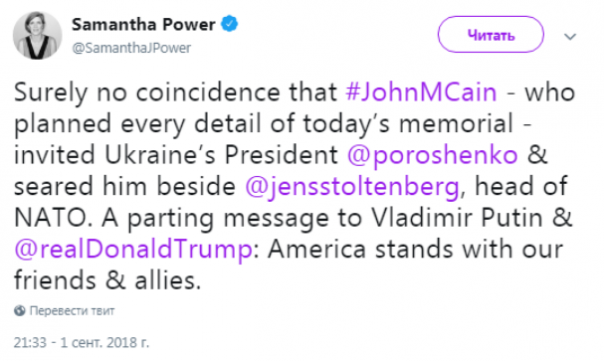 Она обратила внимание на то, что Маккейн сам тщательно планировал "каждую деталь" собственных похорон. Пауэр утверждает, что сенатор неслучайно пригласил на церемонию президента Украины Петра Порошенко и отвел ему место рядом с генсеком НАТО Йенсом Столтенбергом.