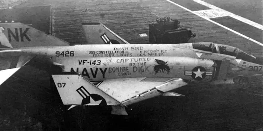 F-4 «Фантом» сел на авианосец «Бон Омм Ричард» — потому и «ОПРИХОДОВАН ЧЛЕНОМ БОННИ». Обидно, и наверняка ведь ещё и неправда.