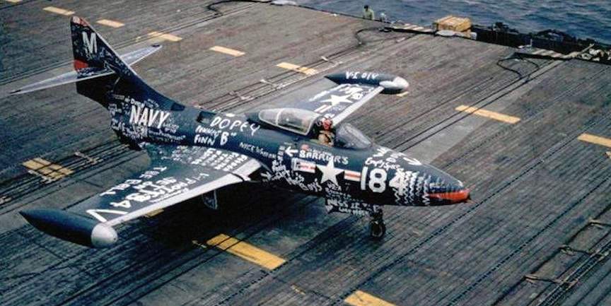 А вот этому F2H «Баньши» с авианосца «Корал Си» CV-43 отказали в принадлежности к военно-морским силам. NAVY зачёркнуто, вместо этого чужие техники предположили, что лётчик «должно быть из ВВС» — сухопутная крыса, то бишь.