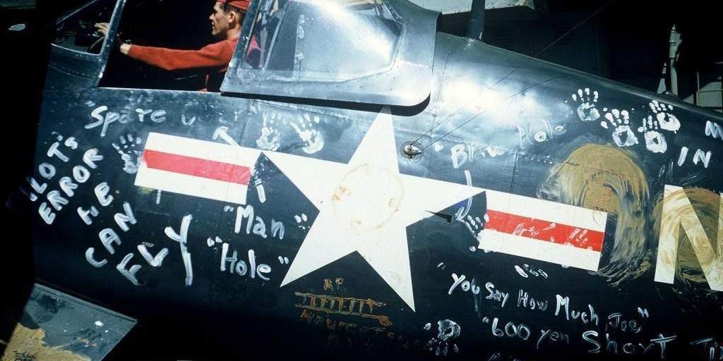 Вот F4U «Корсар» по ошибке сел не там и получил много полезных рекомендаций, нанесённых на крылья и фюзеляж