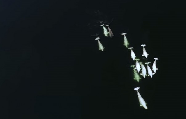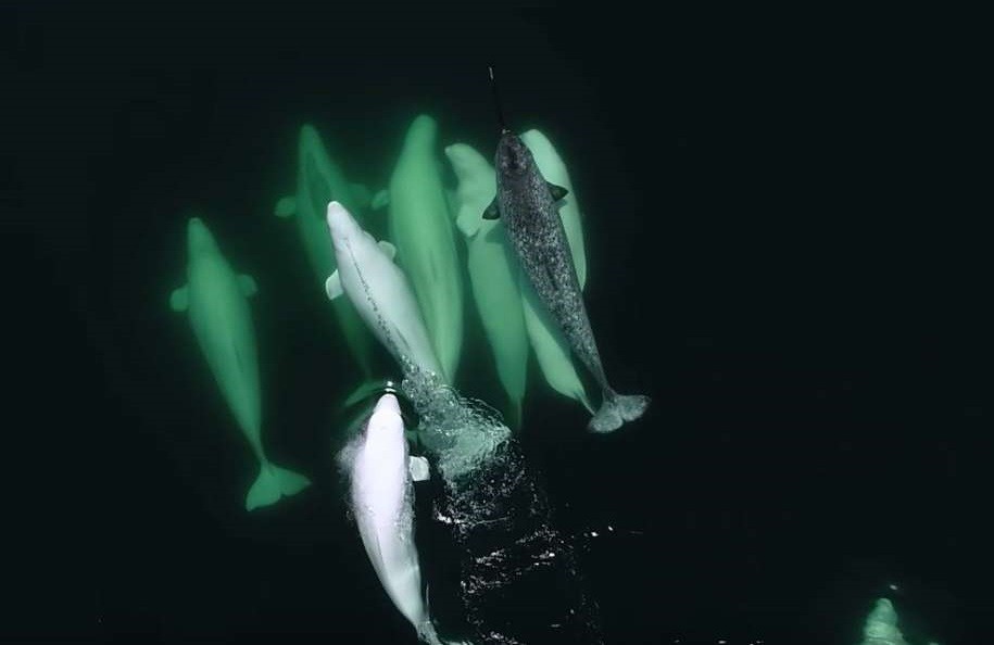 Съемка с дрона позволила задокументировать редкий случай: тесное взаимодействие белух и нарвала.