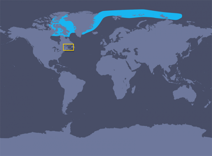 Голубым отмечен ареал нарвалов, жёлтым прямоугольником – устье реки Святого Лаврентия, где биологи встретили группу белух