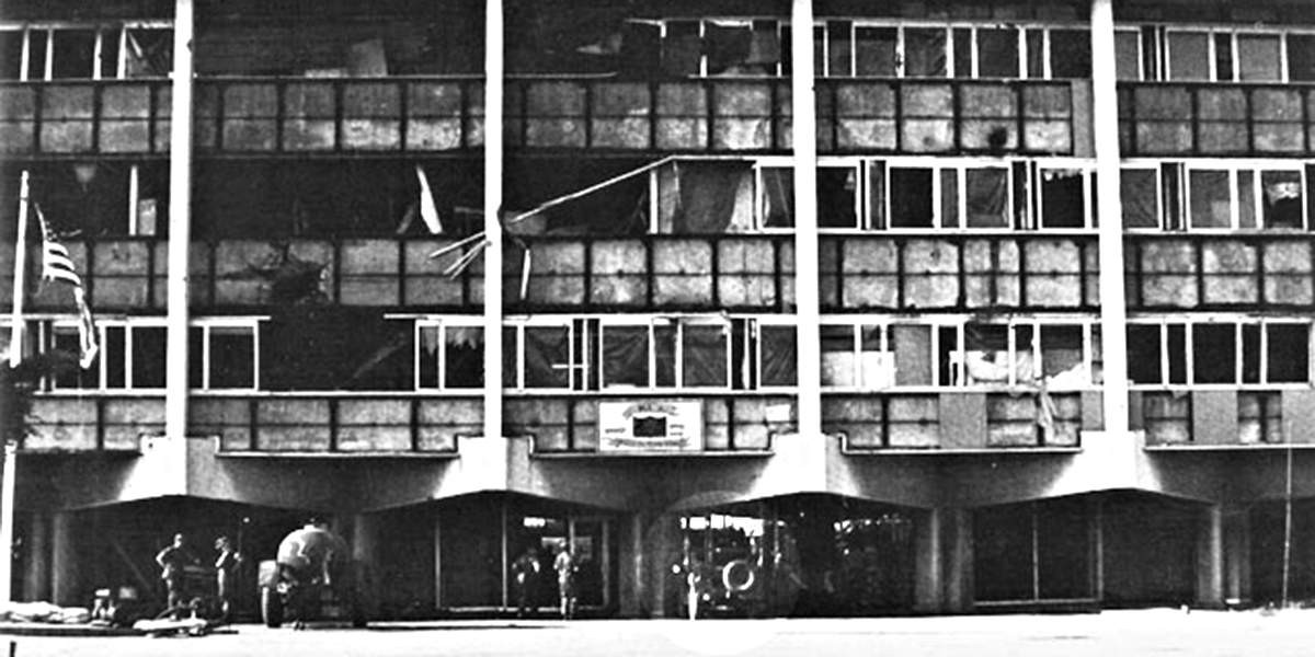 Фасад здания, август 1983 года. Смертник въедет примерно в то же место, где стоит джип