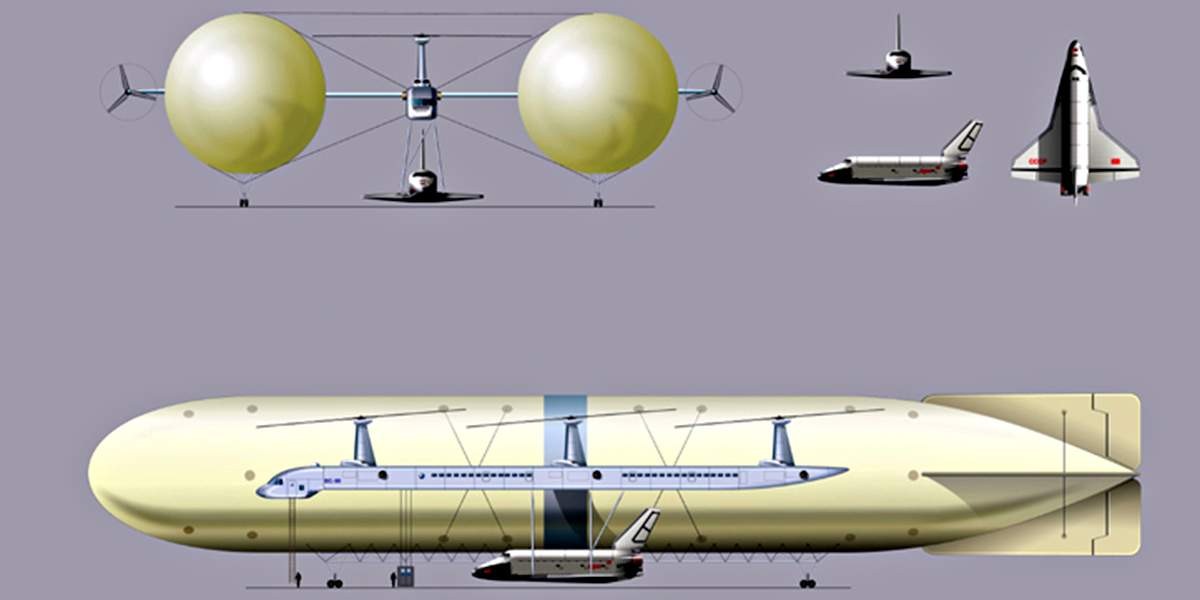 Проект советского дирижабля-вертолёта от КБ Мясищева для перевозки крупных негабаритных грузов, например, челнока «Буран»