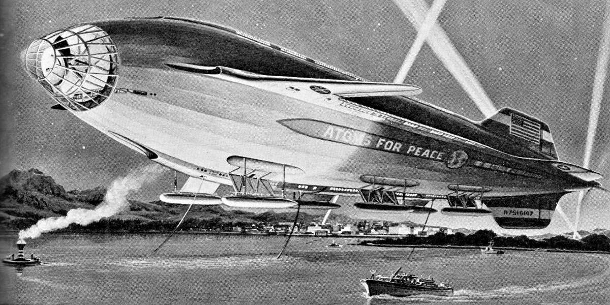 Интерес к атомным дирижаблям в начале 50-х проявляли во многих странах, но основными игроками на этом поле были, конечно, СССР и США. В Америке тогда разработали проект шикарного круизного атомного дирижабля «Атомс фо Пис» («Атомы ради мира»). Он был невероятно комфортным и роскошным. При этом за счёт использования дешёвой энергии атома полёт в каюте низшего класса стоил бы меньше доллара. А красивое и пацифистское название не помешало разработать на его базе атомный летающий авианосец для ВВС США.