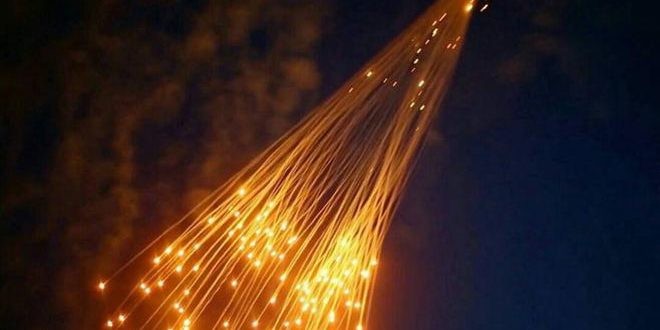 На фото видны огненные следы запущенных снарядов. Как известно, в ходе атаки был применен запрещенный белый фосфор. Источник