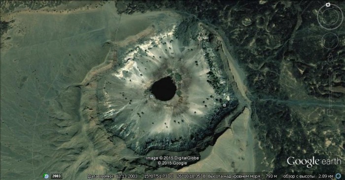 Были и более простые по происхождению кратеры - следы падения сверх мощных бомб (слева еще виден черный минивулканчик - последствия отчасти микроразломов, отчасти атомных реакций)