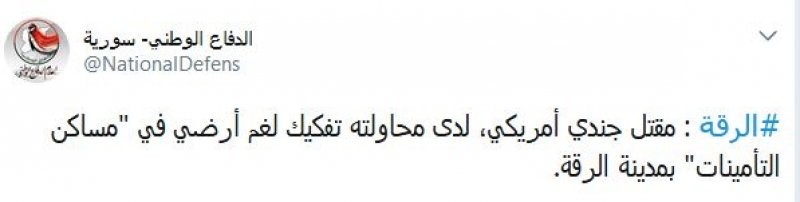 Сообщение опубликовано в официальном микроблоге NDF в Twitter. Уточняется, что американский военный погиб, пытаясь разобрать наземные мины в здании госбезопасности в Ракке.