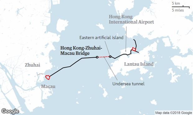 Инженеры создали сложную структуру, которая состоит из нескольких частей надводного моста общей протяженностью 22,9 километра, подводного тоннеля, длина которого 6,7 километра, нескольких искусственных островов, а также специальных пограничных КПП — между материковым Китаем, Гонконгом и Макао в силу их отношений обязателен пограничный контроль.