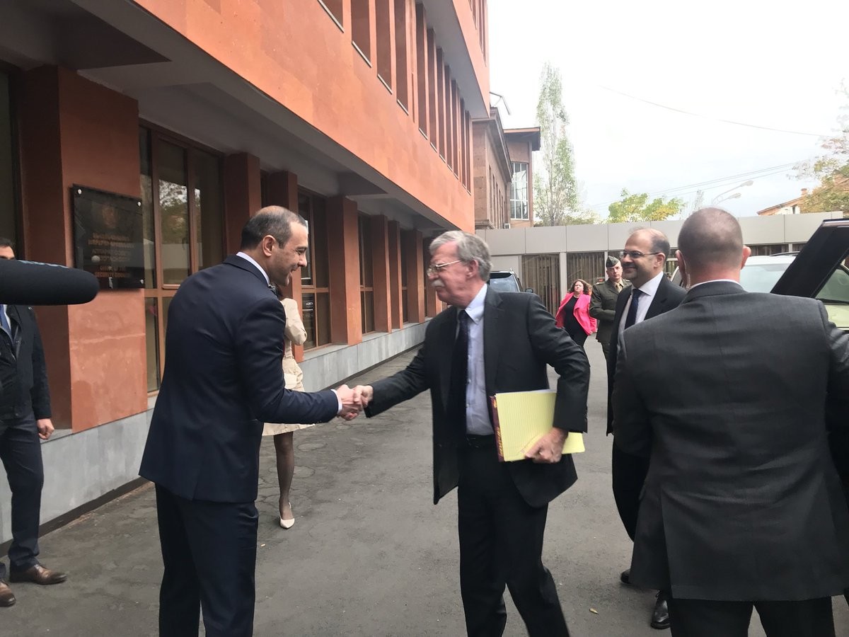 В Ереване переговоры американского юриста-милитариста (чей агрессивный антииранский стиль хорошо известен армянской дипломатический службе) были не менее насыщенными, чем в Баку: Болтон переговорил с и. о. премьер-министра Николом Пашиняном, и. о. министров обороны и иностранных дел, с президентом и депутатами, наведался в возглавляемый Арменом Григоряном Совет безопасности.
