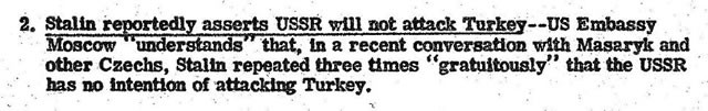 Однако в том же обзоре читаем: Сталин «в недавнем разговоре с министром иностранных дел Чехословакии Яном Масариком трижды настойчиво повторил, что у СССР нет намерения нападать на Турцию».