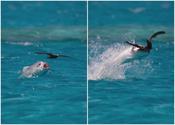 Многие птицы едят рыб, но порой и рыбы (например, акулы) охотятся на представителей орнитофауны. Живущий на Сейшелах гигантский каранкс (лат. Caranx ignobilis) очень эффектно ловит птиц, выпрыгивая из воды; за этим занятием его подкараулили операторы BBC Natural History.