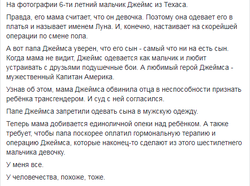 На этом, правда, мать ребенка останавливаться не намерена и теперь хочет воспитывать его в одиночку, а от своего мужа требует раскошелиться на гормональную терапию и операцию для Джеймса, «которые наконец-то сделают из этого шестилетнего мальчика девочку».