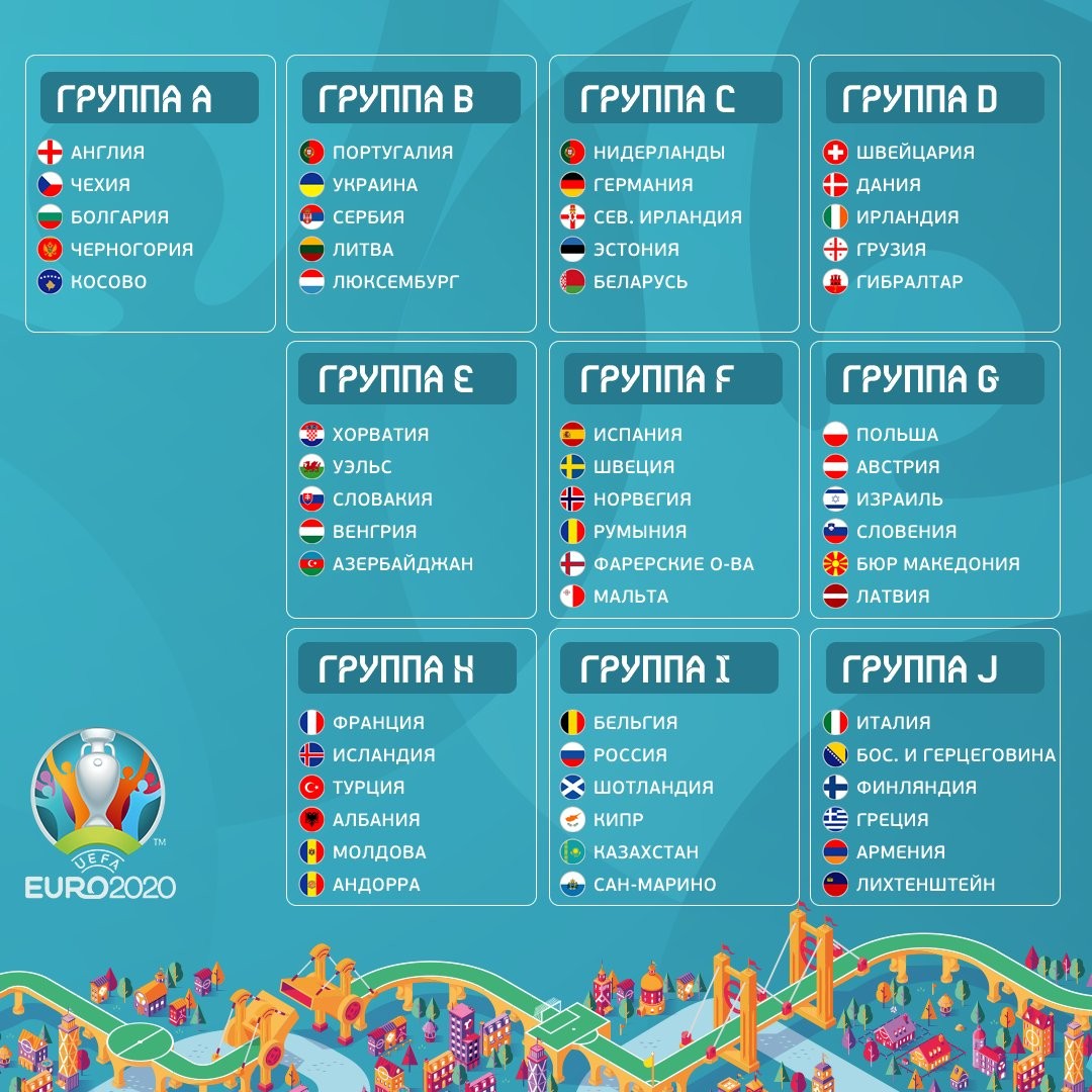 В отборочном турнире примут участие 55 сборных, которые разделены на 10 групп. Пять групп состоят из пяти команд, еще пять – из шести. В финальную стадию Евро-2020 выйдут по две лучшие команды каждой из групп плюс еще четыре сборных, которые по итогам стыковых матчей станут сильнейшими в дивизионах Лиги наций УЕФА.