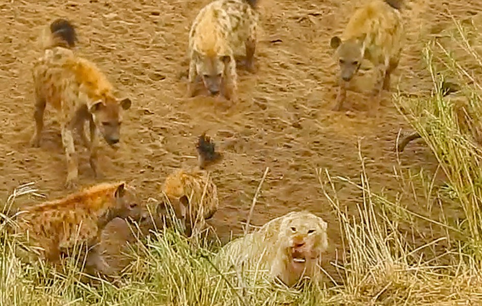 На протяжении нескольких минут хищницы, пользуясь своим численным преимуществом, пытались атаковать льва. Они подступали все ближе, издавая свойственный гиенам хохот и повизгивая. Лев отбивался как мог: он вертелся на месте, грозным рыком встречая атаку той гиены, которая осмеливалась подобраться к нему ближе остальных. Но если исход битвы с одной гиеной может закончиться в пользу льва, то стая гиен вполне способна убить «царя зверей».
