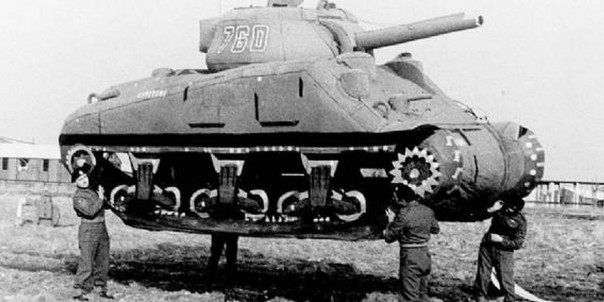 Для этого они разместили на соответствующих направлениях целые фальшивые армии — в частности, вниманию немецких разведчиков и шпионов предлагались надувные танки «Шерман». Уже с расстояния пары сотен метров без бинокля их от настоящих было не отличить.