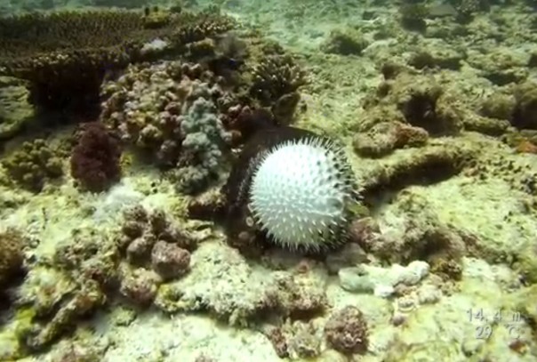 Сначала осьминог пытался втащить рыбу в щель между кораллами, притягивая ее к себе, но рыба не сдавалась и оставалась на месте. Как и другие ее сородичи, при опасности она раздулась, выставив усеивающие ее тело иголки в разные стороны, чтобы дать отпор сопернику.