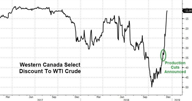 Скидка может сократиться еще сильнее, так как снижение добычи начнется в январе, а производители и переработчики ведут переговоры о будущих поставках. Это, в свою очередь, пойдет на пользу канадским производителям, которые уже начали пересматривать планы капитальных расходов на 2019 год под давлением низкой цены на свою нефть.