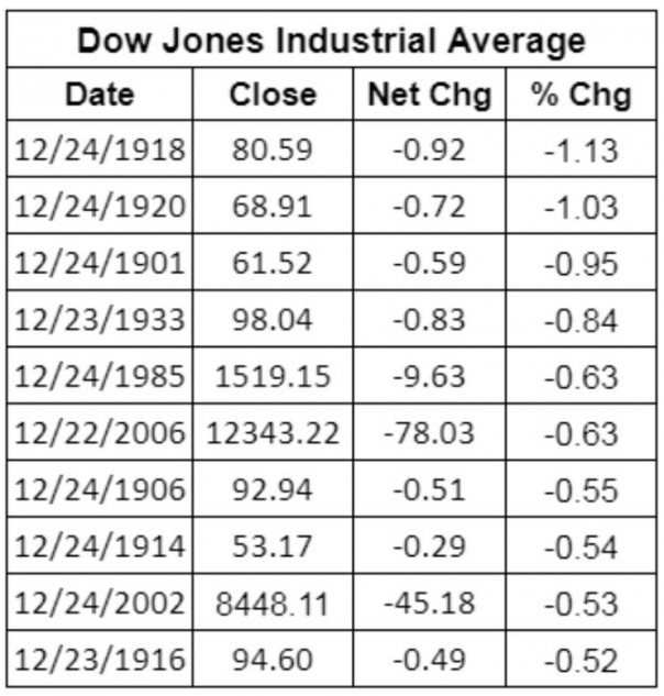 Падение на 2,9% 24 декабря стало худшей динамикой, которую когда-либо показывал индекс Dow Jones в данный предпраздничный (по католическому календарю) день. До этого самое серьезное снижение по Dow Jones произошло 24 декабря 1918 г., когда индекс снизился на 1,1%.