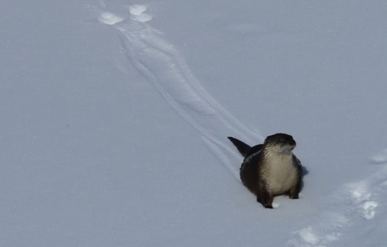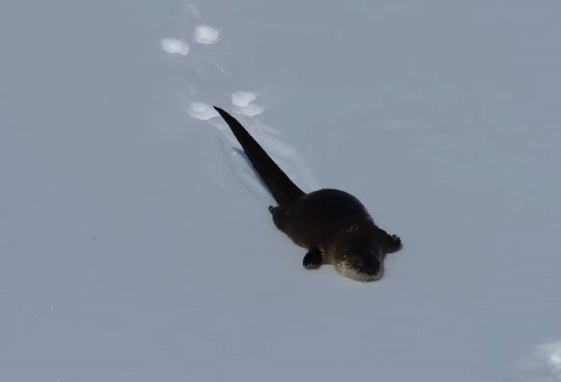Выдры охотятся ночью, но в малонаселенных районах выходят на охоту и в светлое время суток. Это животное – отличный пловец; по суше передвигается прыжками, а зимой прыжки чередуются с длинным скользящим ходом. Именно эту «походку» сняла на видео Барет Хэджес (Barrett Hedges).