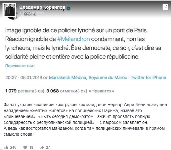 «Фанат украинских/ливийских/грузинских майданов Бернар-Анри Леви возмущён нападением “желтых жилетов” на полицейских Парижа, назвав это “линчеванием”. “Быть сегодня демократом - значит, проявлять полную солидарность с республиканской полицией”, – с пафосом заявляет он.