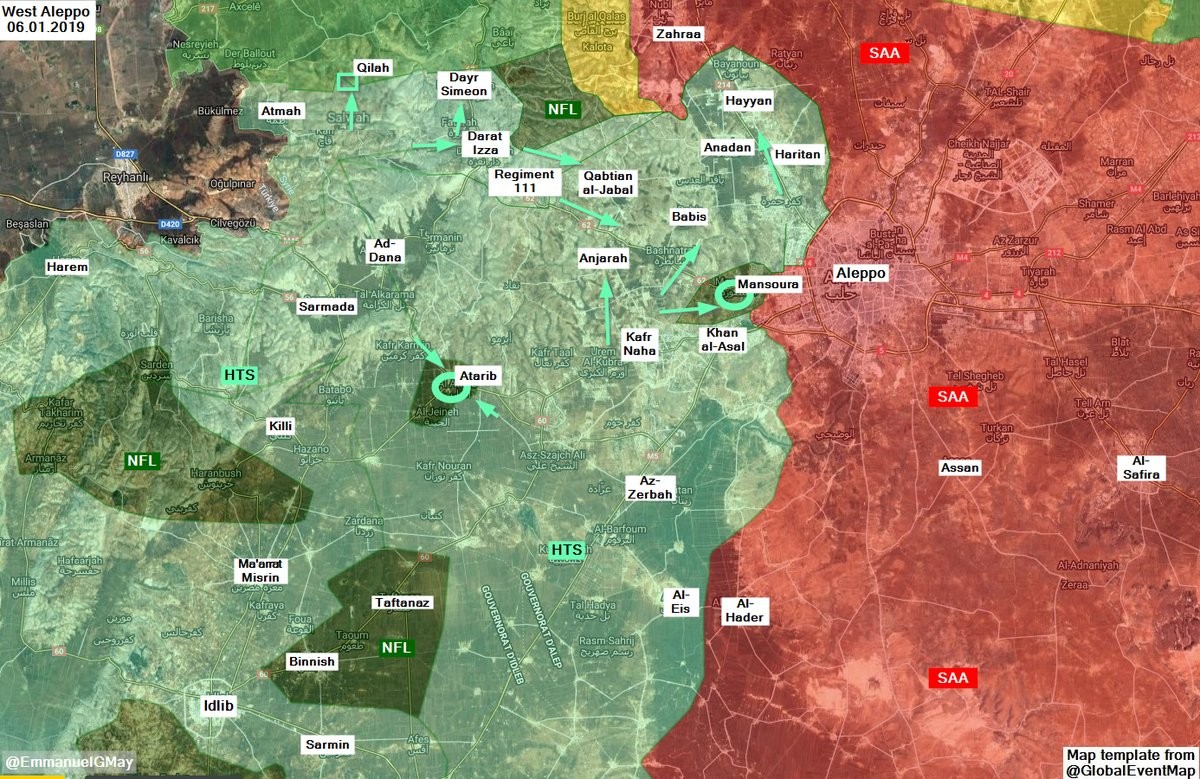 5 января боевики ХТШ взяли под контроль северо-западные пригороды Алеппо Анадан, Хрейтан и Хайян, а также возобновили наступательную операцию в пр. Идлеб и Хама. В частности в пр. Идлеб под контроль ХТШ перешли н.п. Маасаран, Габка, Маар-Шурин, Таль-Манас и Джарджанас.