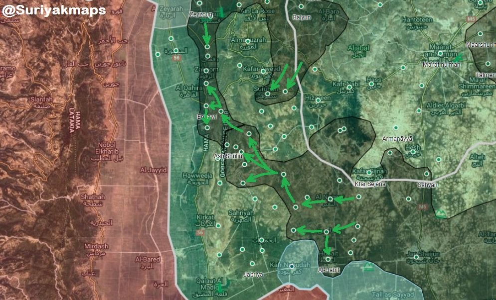 8 января ХТШ активизировала наступательные действия в провинциях Идлеб и Хама. В течение дня террористы отбили у протурецких сил селения Аль-Хамидия, Кулайдин, Дукмак, Закун, Энкави, Фаттира, Сафахун, Фататия, Амакия, Каукаб, Аш-Шулин, Раша, Умм-Нир, Занкун, Термела, Накияр, Аринба, Сут-Дейр, Хирбет Абидин и Касабия.