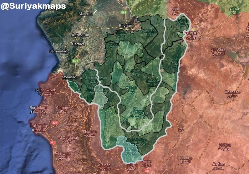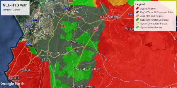 Актуальная карта расположения сил в сирийской провинции Идлиб: группировке «ХТШ» удалось взять под контроль ключевой город Маарат аль-Нуман и несколько десятков других н.п. Протурецкие группировки «Национального фронта освобождения» готовят подкрепления, однако «ХТШ» доминирует.