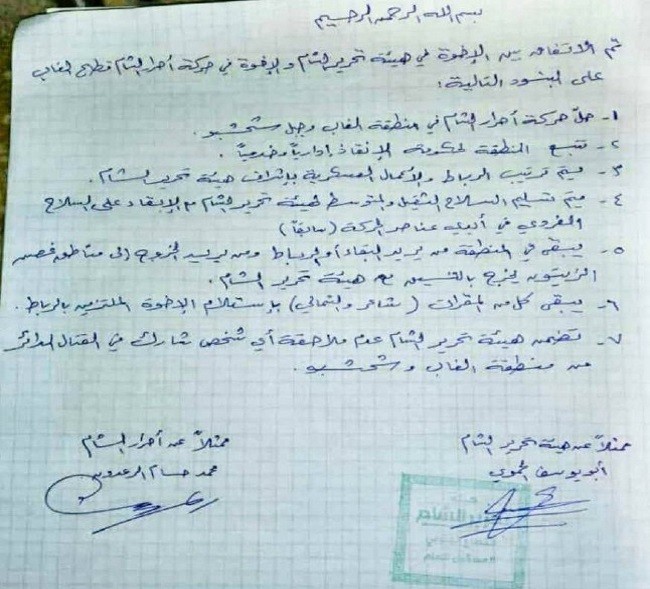 Боевики Ахрар Аль-Шам были распущены в районе горы Шашабо и в районе равнин Аль-Гхаб на западе Хамы, после соглашения с Тахрир Аль-Шам.