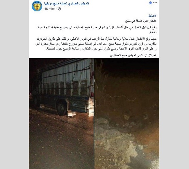 Агентство Аль-Амак (близкое к джихадистам) сообщает о взрыве СВУ боевиков Исламского Государства возле Манбиджа. Местные источники подтвердили, что взрыв прогремел на северо-востоке Алеппо. Известно об одном раненом гражданском лице.
