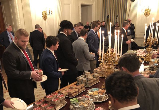 Кроме того, Трамп начал устраивать демонстративные акции – так приглашённую в Белый дом футбольную команду университета Клемсон угощали при свечах едой из фастфудов «МакДональдс» и «БургерКинг». Шатдаун, экономия. Трамп сопровождал это комментариями о том, что это «патриотичная еда».