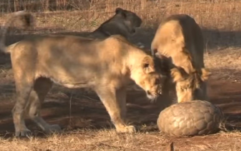 Атака закончилась неудачно, и лев ушел искать новую жертву, а оператор остался ждать, пока панголин развернется, чтобы убедиться, что с ним все в порядке. В конце концов осторожный зверь лишь слегка высунул свою мордочку из плотного клубка брони, а затем снова спрятался. Источник