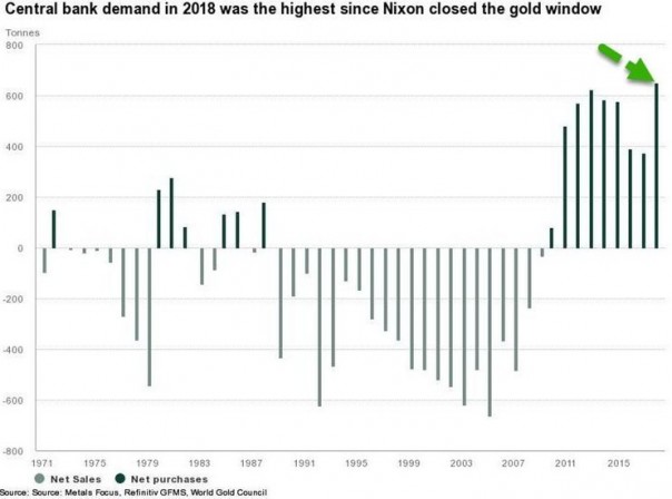 Объем чистых покупок золота со стороны центральных банков различных стран мира, по данным Всемирного совета по золоту, в 2018 г. составил 651,5 тонны, что стало максимальным значением с 1967 г.