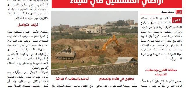 10.30. Еженедельное издание «аль-Наба», близкое к боевикам группировки ИГ*, опубликовало статью о нападениях на севере Синайского полуострова. Местная ячейка террористов взяла ответственность за более чем 70 атак, в результате которых была разрушена строительная техника. Так «вилайят Синай» выступает «в защиту» домов и земель мусульман, резюмирует издание боевиков.