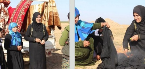 12.35. Женщины-езиды, родом из иракского Синджара освобождены силами арабо-курдского альянса SDF — они показательно сжигают свои черные бурки, которые вынуждены были носить на территориях, подконтрольных ИГ*. Сейчас они открывают свои лица для того, чтобы их смогли опознать родные.
