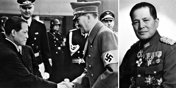 Союзники: посол Японии в Берлине Хироси Осима и рейхсканцлер Германии Адольф Гитлер. Справа парадный портрет генерал-лейтенанта Осимы с тем самым «Золотым большим крестом ордена Заслуг германского орла» (под нагрудным карманом)