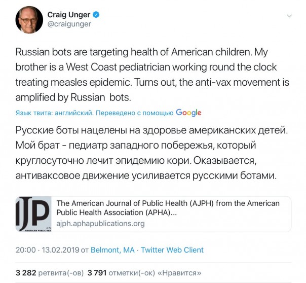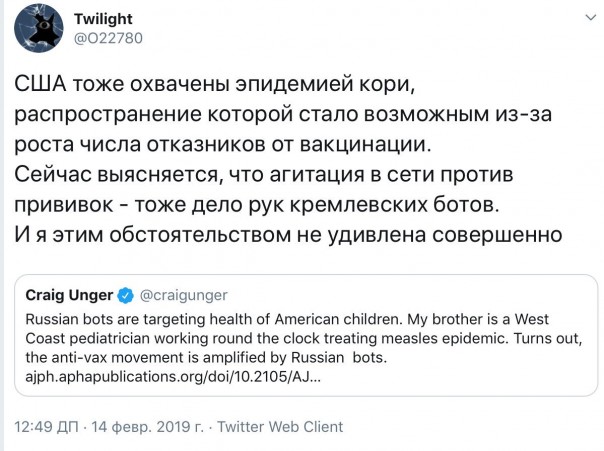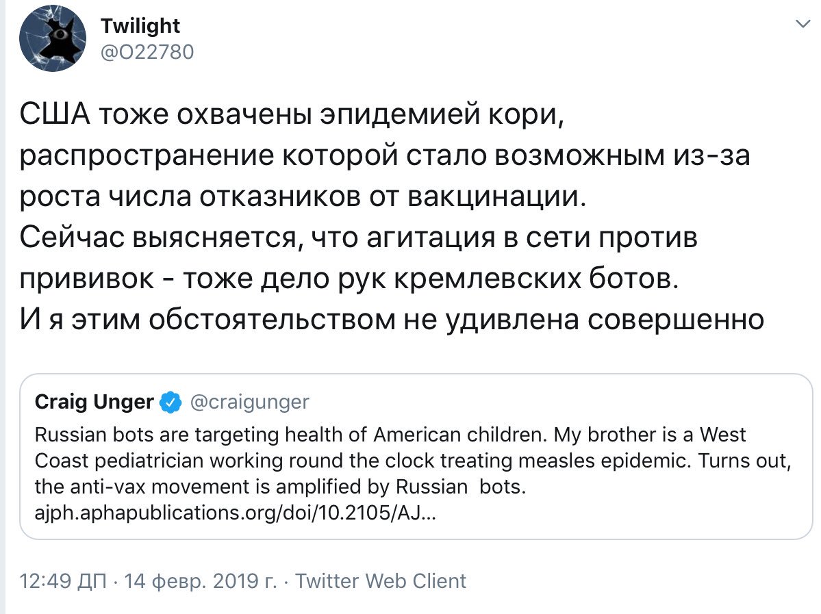 Но, понятное дело, что сегодня в тренде оголтелая русофобия, а критическим мышлением обладают не только лишь все. Потому посты в соцсетях о том, как именно Россия спровоцировала эпидемию кори по обе стороны Атлантики, - пользуются дикой популярностью.