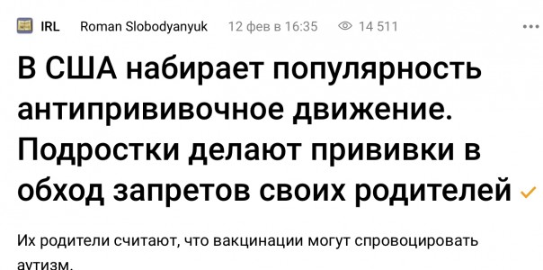 Начнём с того, что мода отказа от прививок в Россию и страны СНГ пришла именно с Запада. Я чётко помню массу статей со ссылкой на американских и европейских «специалистов», которые популярно рассказывали о вреде вакцинации.
