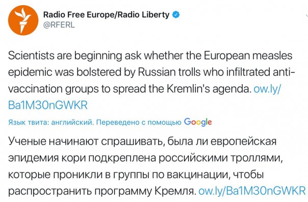 Со вчерашнего дня в западных соцсетях идёт массовое нагнетание на предмет того, что эпидемия кори на территории ЕС и США - дело рук русских троллей, которые заставляют тамошнее население отказываться от прививок.