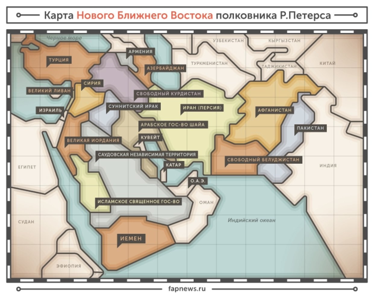 Представители Соединенных Штатов такими заявлениями в очередной раз наглядно продемонстрировали, каковы главные цели вмешательства в Сирии, отметил, публицист, востоковед Андрей Онтиков. Он напомнил о так называемой карте Петерса, на которой в 2006 году были отражены изменения границ ближневосточных государств по плану Вашингтона.