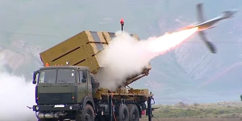 А барражирующий боеприпас стартует, ищет цель в полёте, находит — и пикирует прямо на неё. Бабах! Цель поражена.